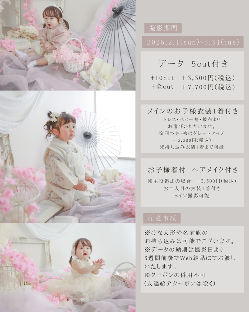 ・全カット:¥7,700・四つ身、袴変更:¥2,200・主役追加:¥3,300※主役追加→お2人目の衣装1着付き、メイン撮影可能